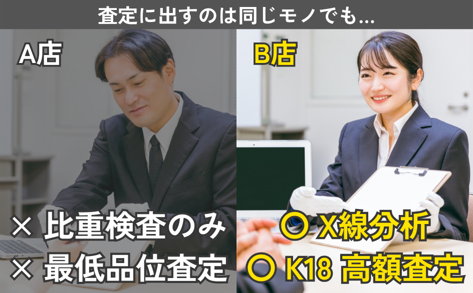 使っている分析機器や鑑定士の専門性が店ごと違うので、買取額には差が出るもの。