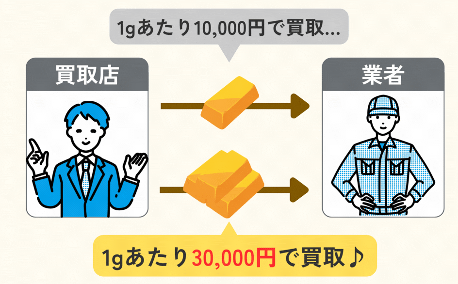 ※通常、金買取店では一般顧客向けの買取価格と業者向け価格は分けて取引されます。