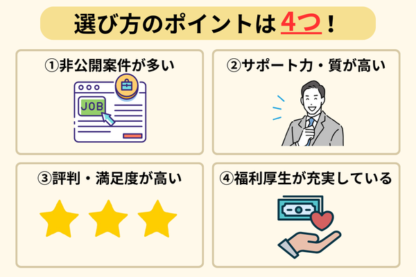エージェント選びで失敗しないために、必ず押さえておくべきポイントが4つあります。特に、4つ目が重要!