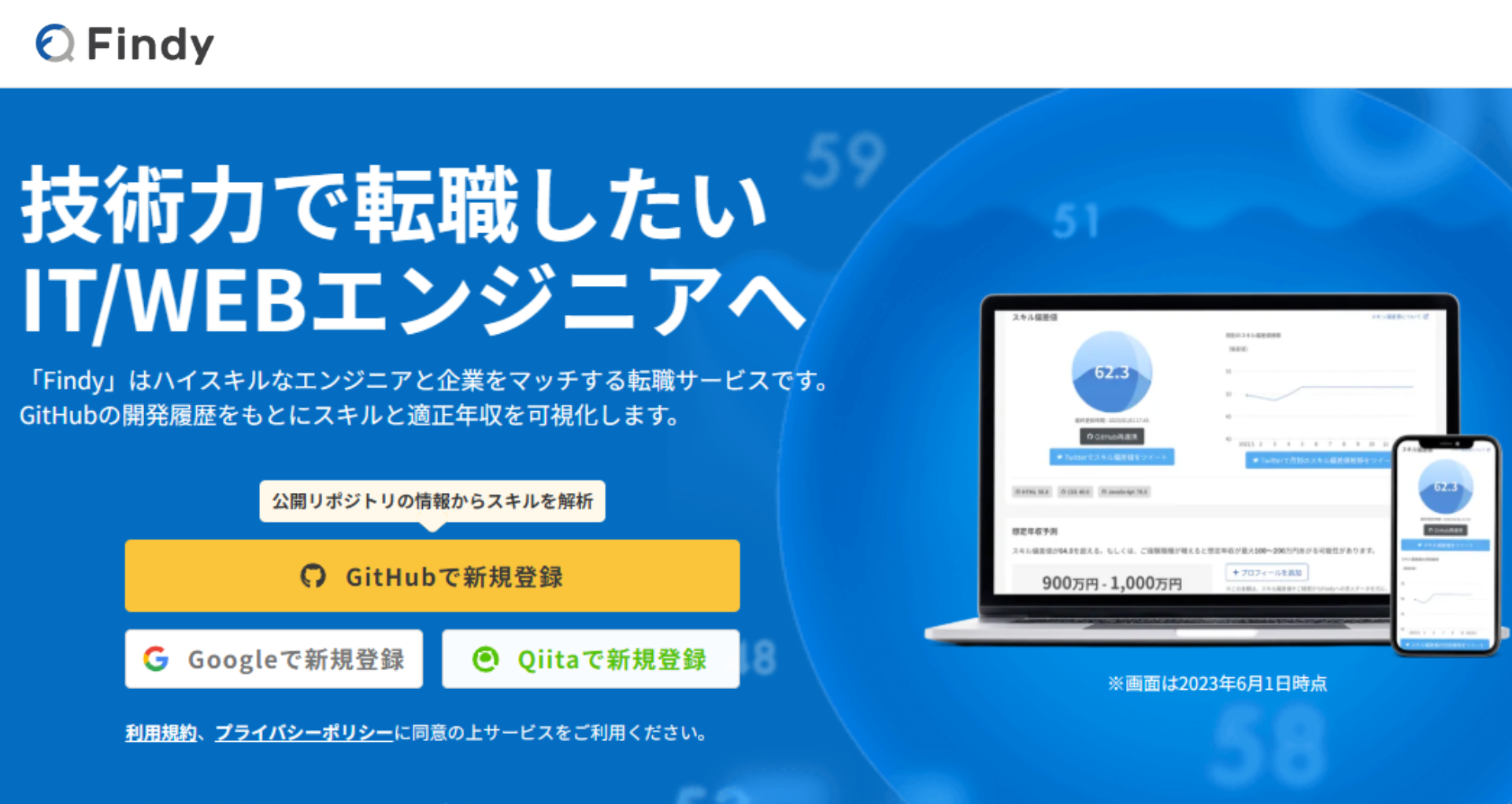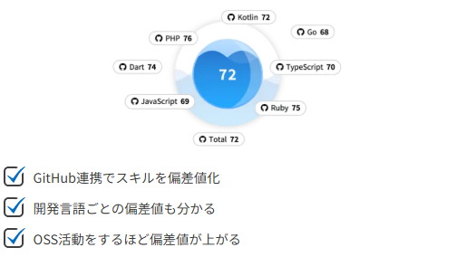 Findyに登録して、GitHubと連携すると、開発履歴をもとに、言語別にスキルを偏差値化してくれます。