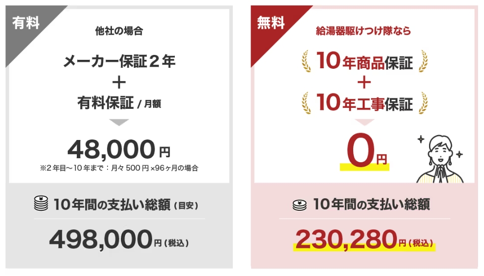 給湯器の寿命である10年間の無料保証が付いているか。工事・商品共に保証付きがベスト!