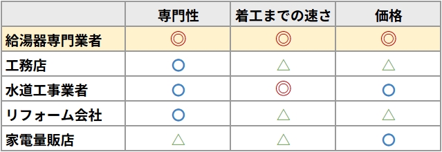 | 給湯器の価格 | 見積もり | 対応の早さ |